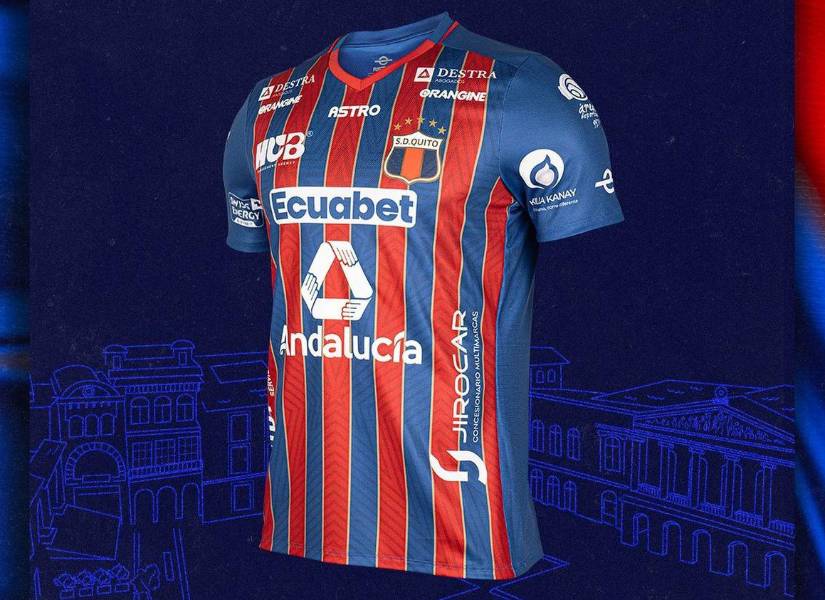 La camiseta titular tiene los colores que caracterizan a Deportivo Quito, el azul y el rojo con franjas verticales. Luego, la alterna es de color negro con unas rayas en el pecho de color azul y rojo.