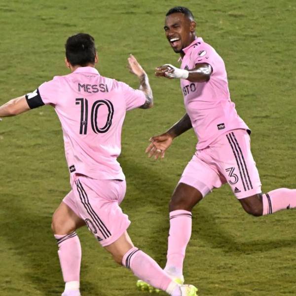 Lionel Messi y Dixon Arroyo festejan un gol del Inter Miam( )