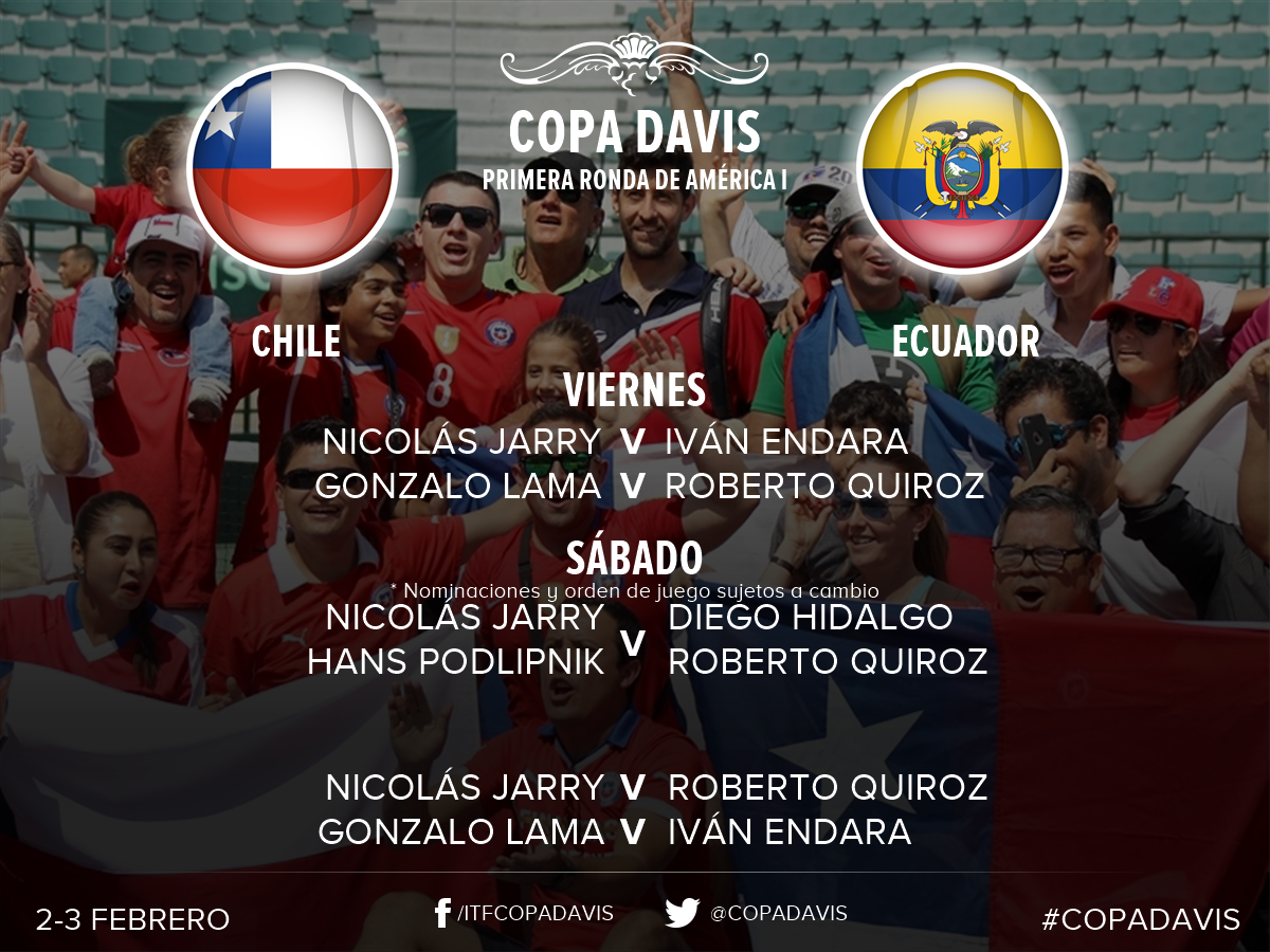 De acuerdo al sorteo, el ecuatoriano Iván Endara disputará el primer punto de la serie ante el local Nicolás Jarry. A continuación, entran en escena Roberto Quiroz y Gonzalo Lama.