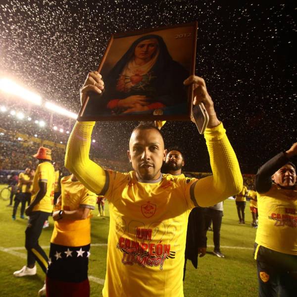 Édison Vega festeja el título de LigaPro obtenido con Aucas tras derrotar en la final a Barcelona SC.( )