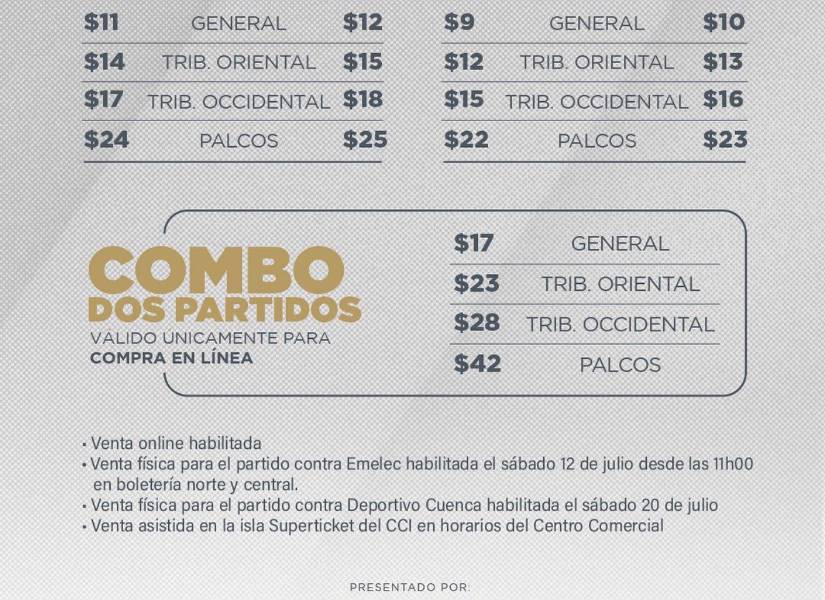 Precios de las entradas para el partido vs. Emelec y el combo de los dos partidos de local.