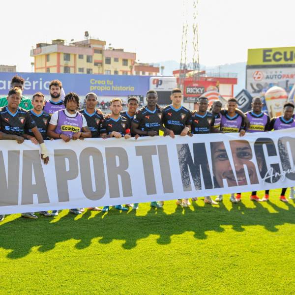 Los jugadores de Liga de Quito, en el duelo ante Técnico Universitario, saltaron al campo de juego con una pancarta que contenía un mensaje emotivo, "Va por ti Marco Angulo".