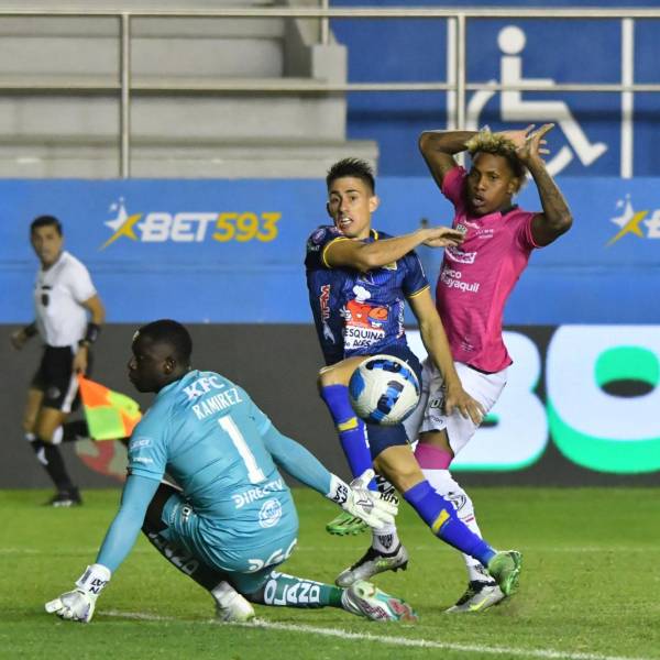 A los 28 Delfín también tuvo su oportunidad. Centro de Maikel Reyes que buscaba el cabezazo de Facundo Castelli, pero el arquero Ramírez salió a tiempo y puñeteó el balón.