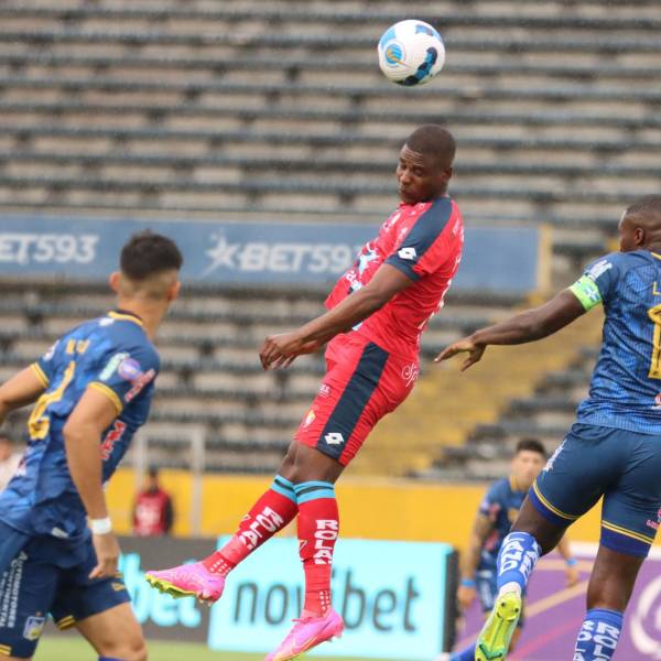 Jugador de El Nacional intenta cabecera el balón ante la marca de dos defensores de Delfín ( )