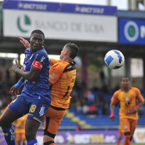 Luis Caicedo, capitán del Delfín, disputa el balón con Francisco Gatti, de Libertad de Loja.( )