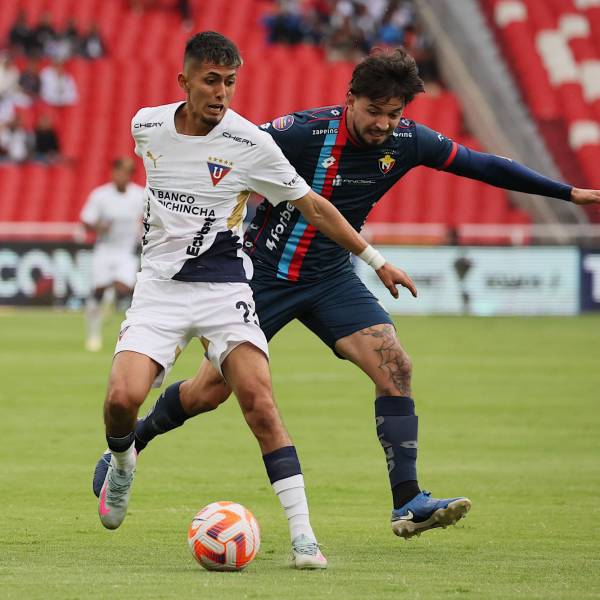 Melvín Díaz, jugador de Liga de Quito, disputa el balón con el defensa de El Nacional, José Flor por la LigaPro Ecuabet conectada por Xtrim( )