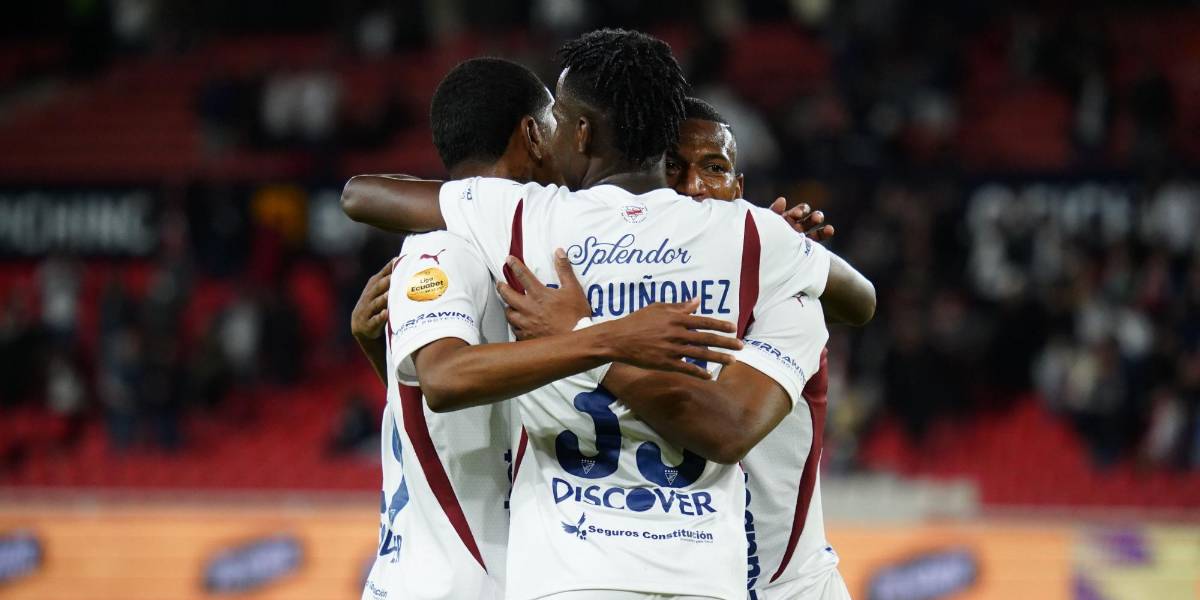 Jugadores de Liga de Quito celebran el gol de Leonel Quiñónez contra Orense SC por la carta fecha del hexagonal principal de la LigaPro ( )