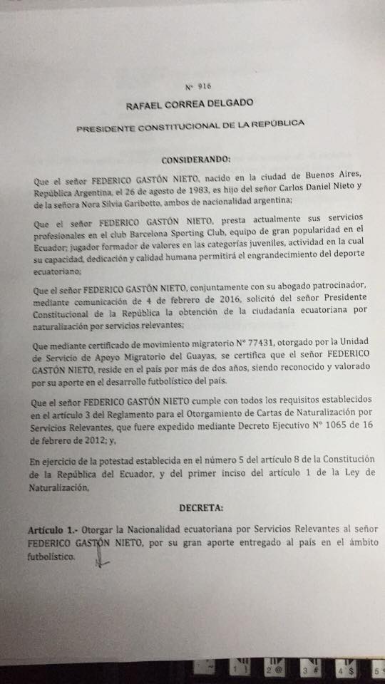 El delantero Federico Nieto logró obtener su carta de naturalización como ecuatoriano y podrá ser inscrito en el torneo nacional sin ocupar plaza de extranjero.