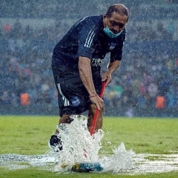Empleados del club intentaron ayudar a la cancha con escobas y más pero sin mucho éxito. El juez central designado, Carlos Orbe dio 45 minutos para esperar si el clima ayudaba.