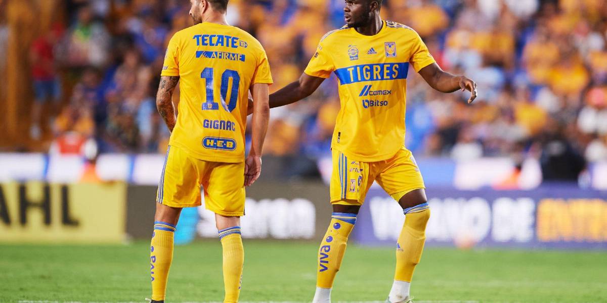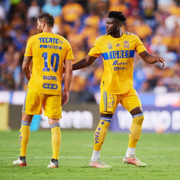 Jordy Caicedo (d) junto a André-Pierre Gignac durante un partido con Tigres en el 2022.( )