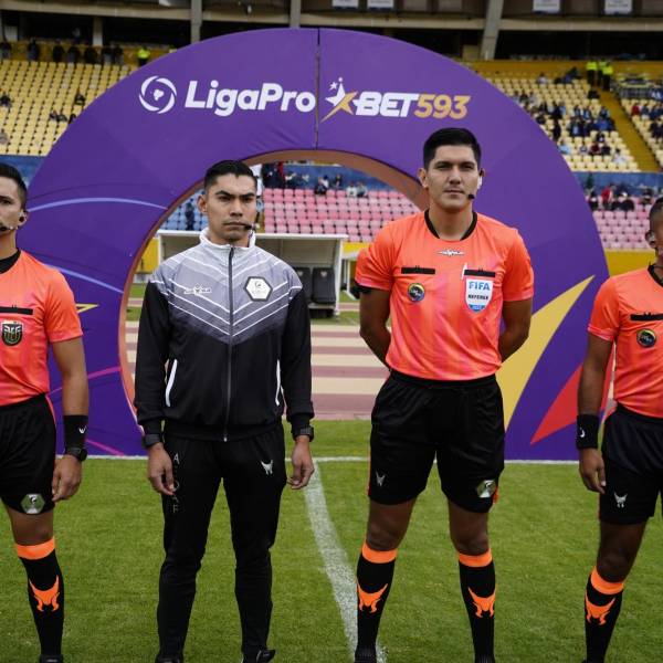 Una cuarteta arbitral ecuatoriana antes de dirigir el partido de LigaPro entre Universidad Católica y Guayaquil City, en el 2023.( )