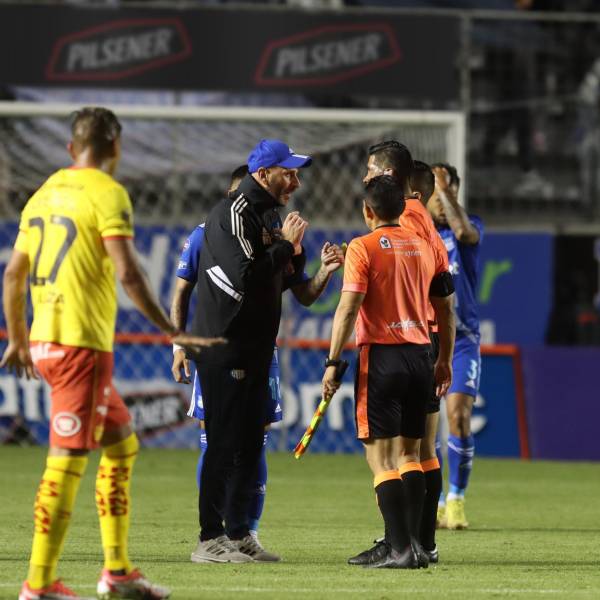 Miguel Rondelli, DT de Emelec, dialoga con los árbitros en el entretiempo del partido ante Aucas, que perdió por 2-1, en Quito.( )