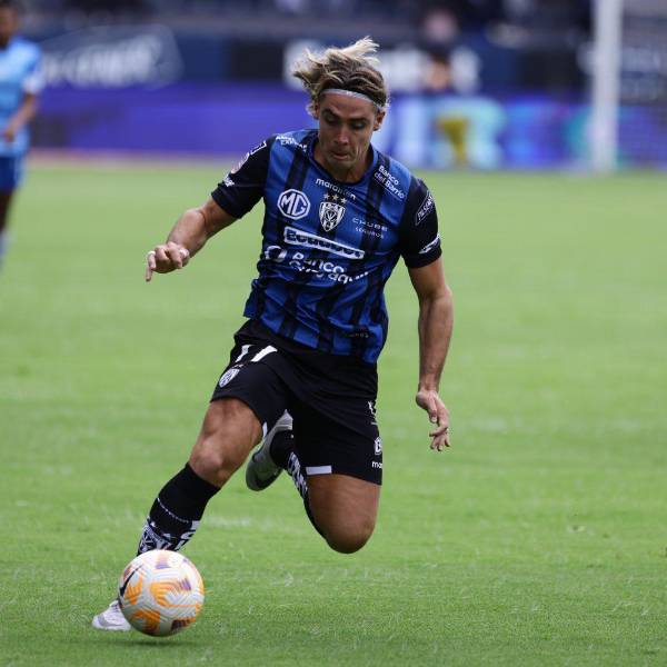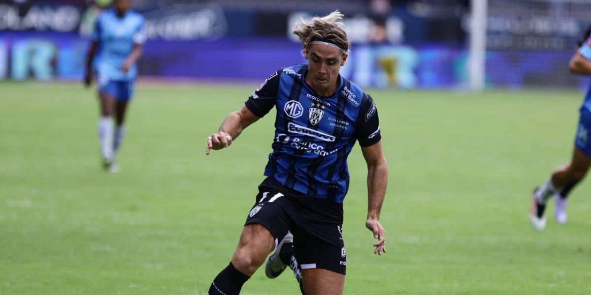 Facundo Castelli conduce el balón en un partido con Independiente del Valle por la LigaPro Ecuabet conectada por Xtrim( )