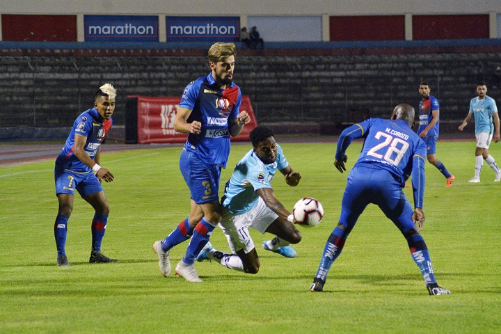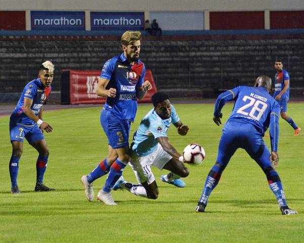 Jugadores de Olmedo y Universidad Católica en la disputa del balón. Foto: API.