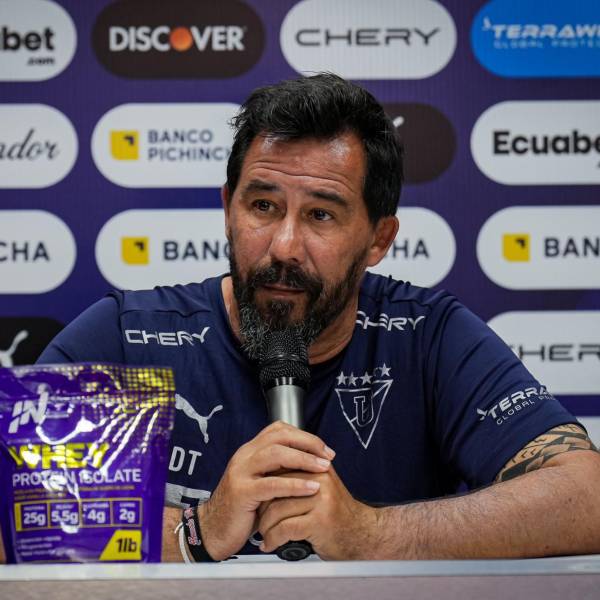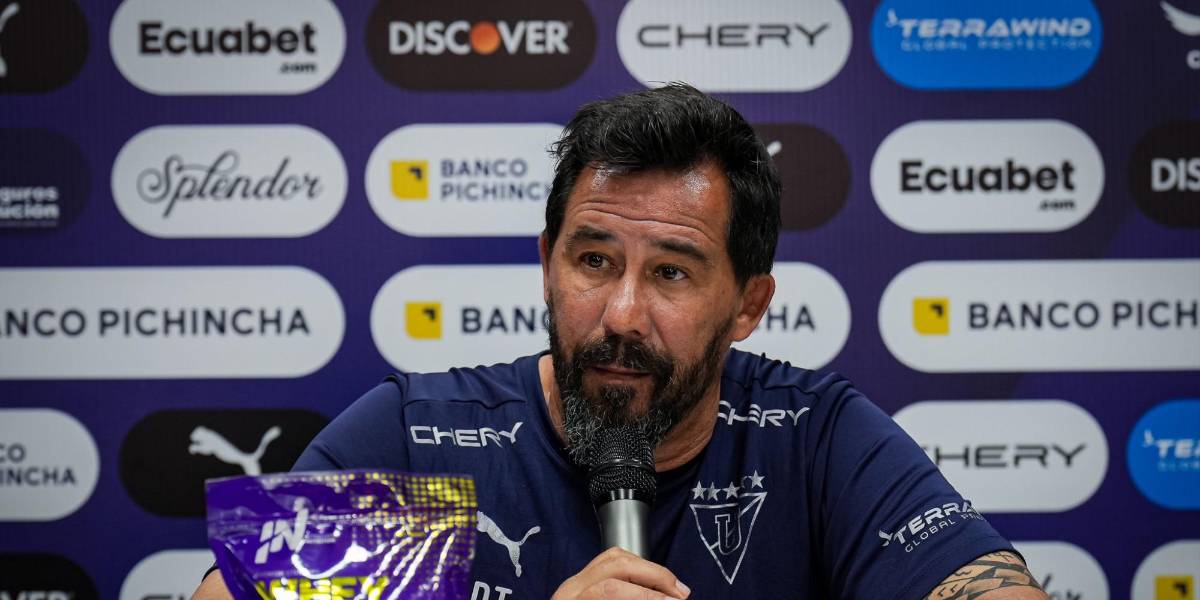 El entrenador de Liga de Quito, Pablo Sánchez, en rueda de prensa ( )