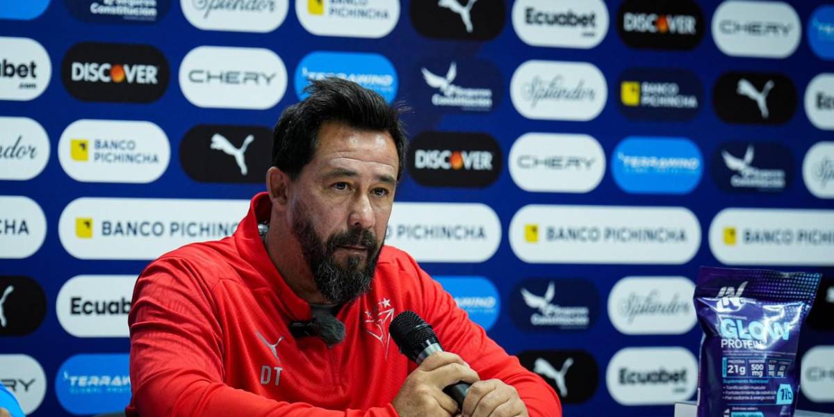 El entrenador de Liga de Quito, Pablo Sánchez, en rueda de prensa ( )