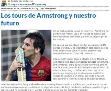 “A Armstrong se lo acusa de haberse aplicado la hormona somatotrópica, entre otras sustancias como la EPO. Es decir, la misma que le administraron a Lionel Messi”, decía el artículo en clara referencia al tratamiento de crecimiento que recibió Messi en su juventud.