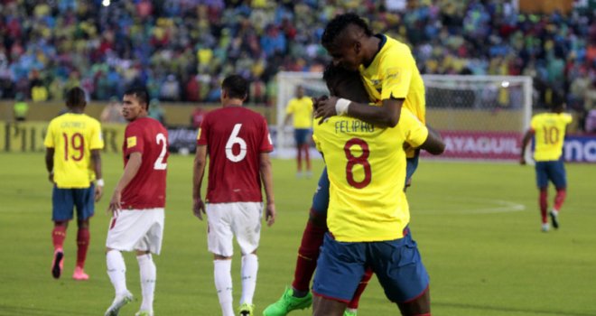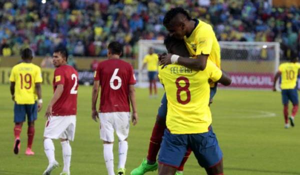 QUITO, Ecuador.- Bolaños y Caicedo festejan el triunfo. Foto: AFP.