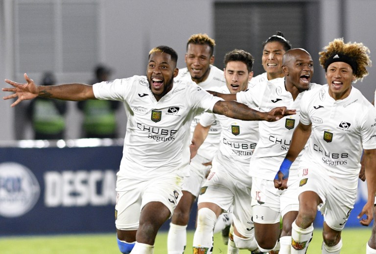 COCHABAMBA, Bolivia.- Los jugadores del Deportivo Cuenca celebran luego del triunfo sobre Wilstermann. Foto: AFP