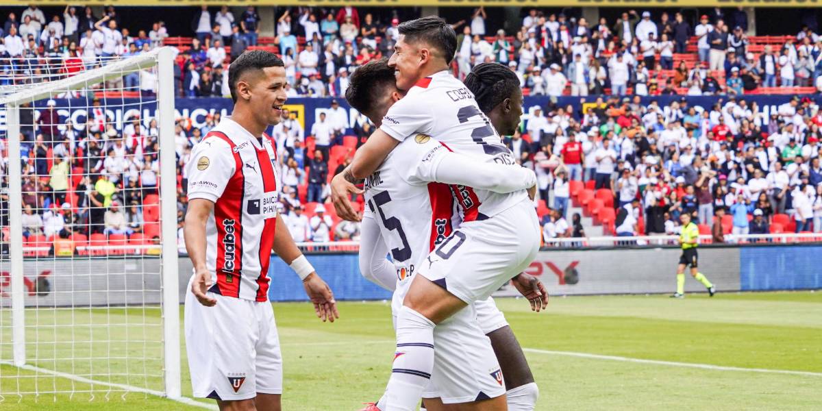 Jugadores de la Liga de Quito celebran el gol de Gabriel Villamil contra Deportivo Cuenca ( )