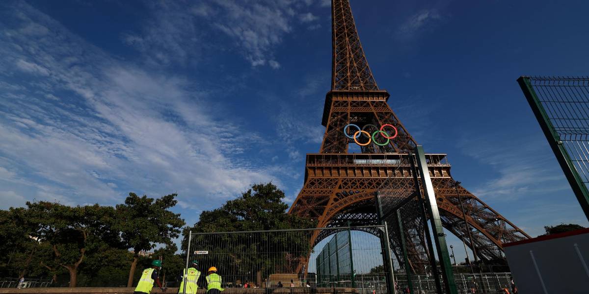 Una vista panorámica de la Torre Eiffel en París, adornada por los anillos olímpicos.( )
