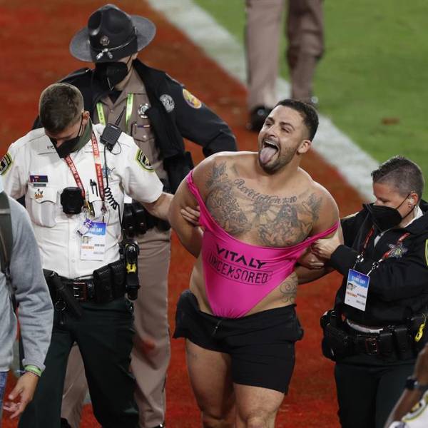El "espontáneo" del Super Bowl llevaba puesto un traje de baño de una pieza de color rosa neón y con corte tanga y encima un calzón negro que logró bajarse mientas forcejeaba con la policía para mostrar las nalgas.