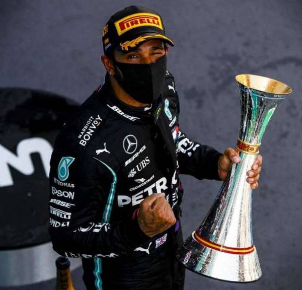 Hamilton con el trofeo tras la carrera. Foto: Internet.