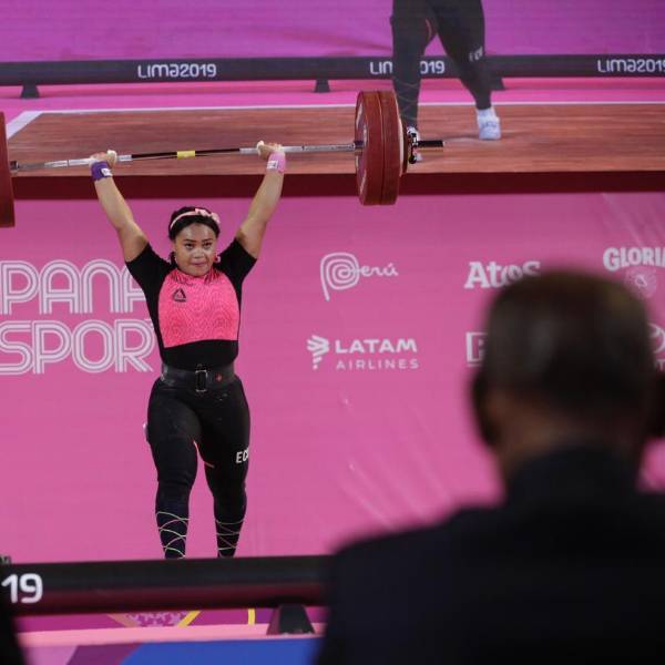 Angie Palacios también logró 9 medallas de oro, pero en la división 64 kg. Ella levantó 104 kg en arranque, 125 kg en envión, con un total de 229 kg.