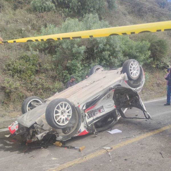 Imagen del auto accidentado en el ingreso de Aguaján , ruta donde se cumplía una nueva etapa del Rally Vuelta a la República del Ecuador.( )