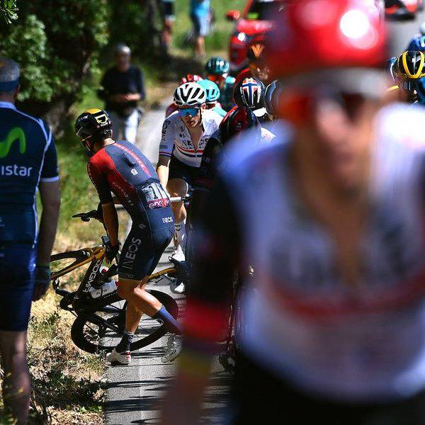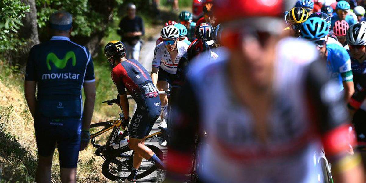 Apenas sucedió la caída de Carapaz el equipo Ineos reaccionó de inmediato y sus compañeros asistieron al carchense para que pueda volver a la competencia y de esta manera unirse a sus gregarios Castroviejo y Porte.