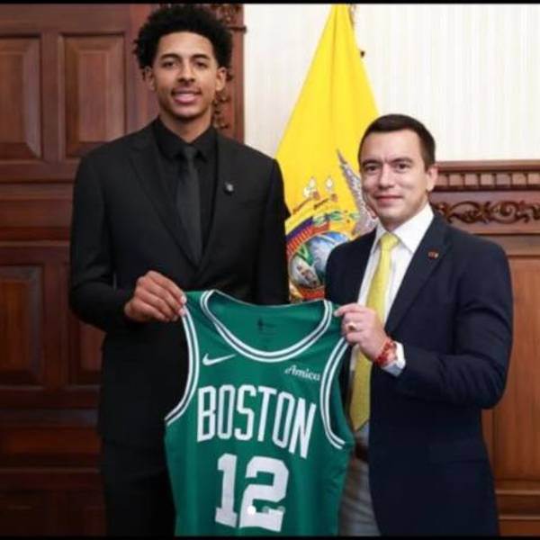 RJ Luis Jr., ecuatoriano en la NBA, se reunió con el presidente Daniel Noboa y le regaló su camiseta de los Celtics