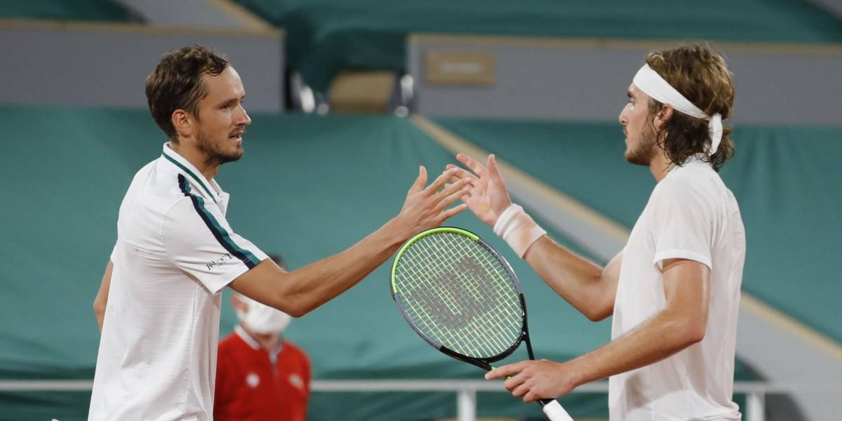 El giego Stefanos Tsitsipas se da la mano con el ruso Daniil Medvedev después de un partido en 2021. ( )