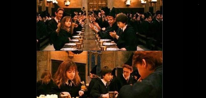8. (Harry Potter y la Piedra Filosofal) Primero Harry aparece al frente y luego al lado de Hermione. -