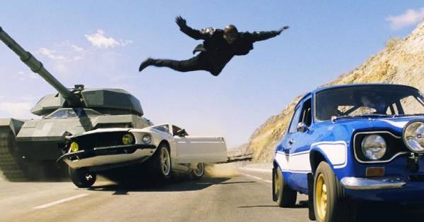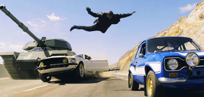 En la última entrega de esta saga de autos tuneados nuestros protagonistas protagonizan un “accidente” en el cual el personaje de Michelle Rodríguez sale despedida al horizonte y Vin Diesel salta desde su auto en la dirección contraria. La espectacularidad de la escena nos hace olvidar las leyes físicas y la resultante de un encuentro entre dos cuerpos a esa velocidad.
