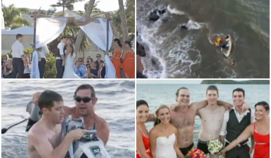 Ambos posaban en una playa de Queensland, Australia, inmortalizando en video los primeros momentos de su vida juntos. De pronto, el camarógrafo se percata de que en el agua hay un pescador en peligro. Los padrinos no lo pensaron dos veces, se quitaron la ropa y se lanzaron al agua al rescate del pescador, cuya barca se había volcado.