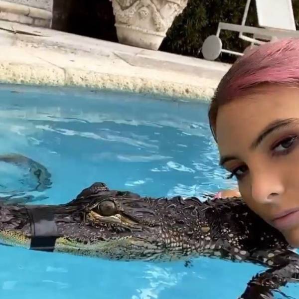 La cantante publicó fotos nadando con el reptil, el cual tenía el hocico con cinta.