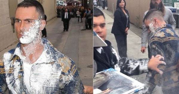 Adam Levine estaba saludando a sus fanáticos, cuando un hombre no identificado le lanzó una bomba de azúcar que estalló en su rostro.