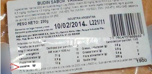 La imagen del etiquetado, en la que se puede leer que una rebanada de budin (pastel) contiene 12 gramos de cocaína, corrió como la pólvora en Internet obligando a los responsables de los supermercados a retirar rápidamente el producto de sus locales.