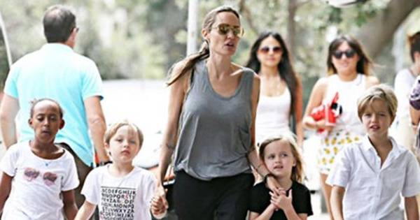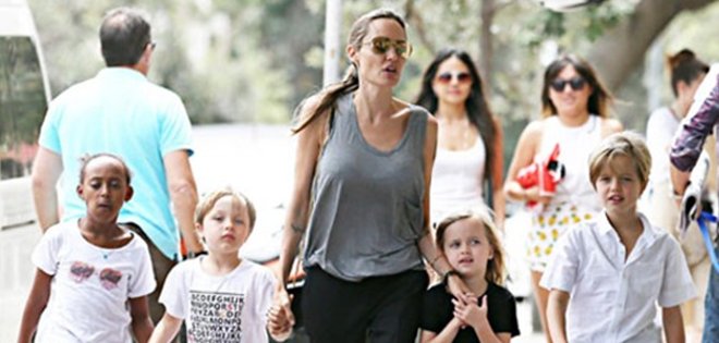 Este fin de semana la actriz salió a pasear con los niños por las calles de Sídney. Vestida de un modo informal, con camiseta gris de tirantes y sus habituales gafas de aviador, la bella actriz llevó a los más pequeños, Zahara, de 8 años, Shiloh, de 6, y los mellizos Knox y Vivienne, de 5, a comprar nuevos cuentos y libros para su colección.