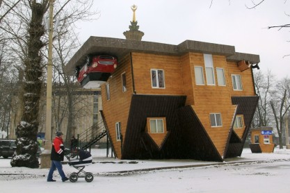 Una casa “invertida”, con el tejado clavado en la nieve en Moscú.