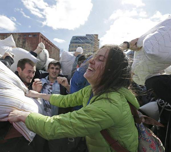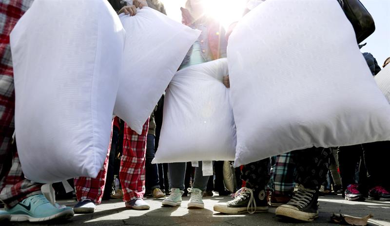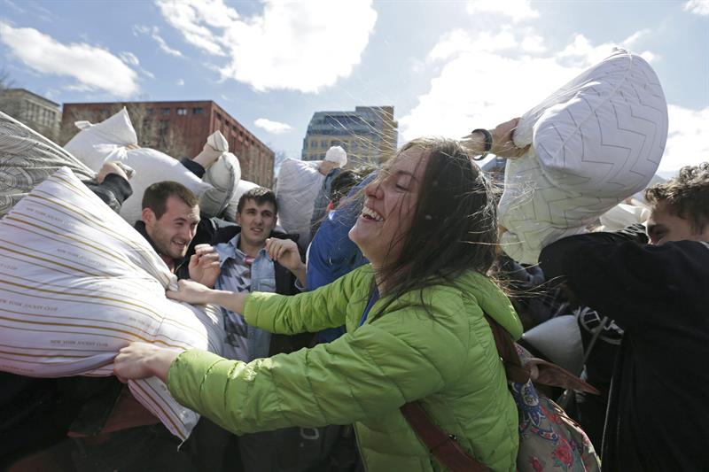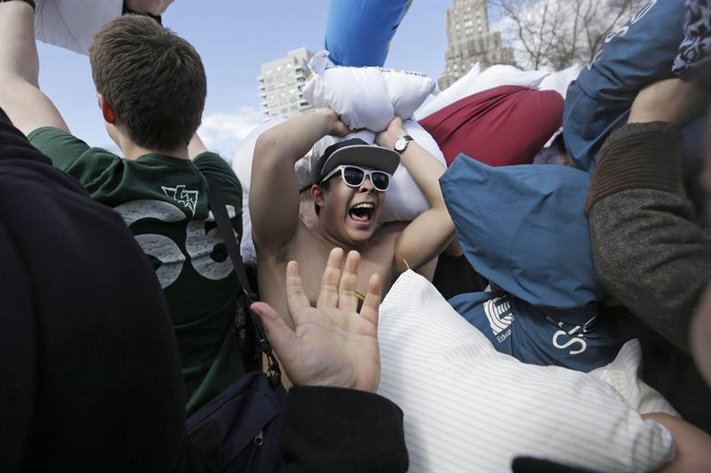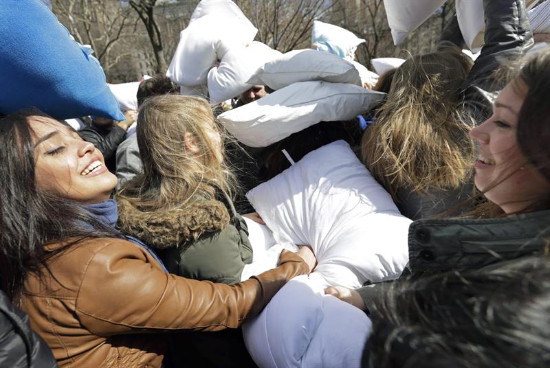 Cientos de personas participaron hoy en una festiva pelea de almohadas en pleno centro de Nueva York, una imagen que se repitió en varias ciudades de todo el mundo con motivo del "Día Internacional de la Pelea de Almohadas".
