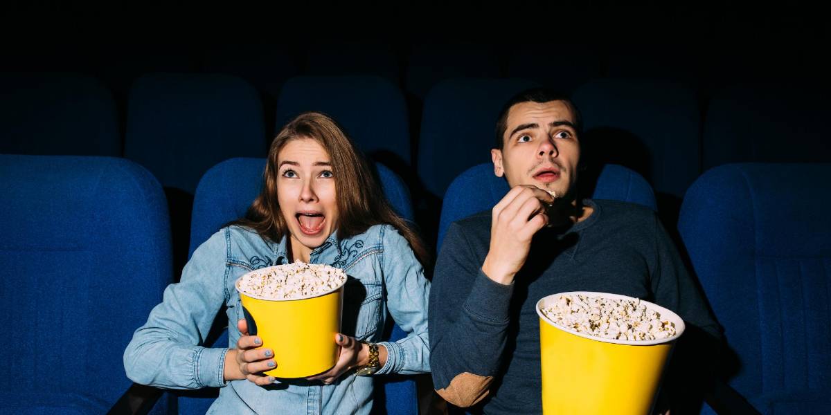 Cinema day, young couple with popcorn looking horror movie in cinema at their date.( )