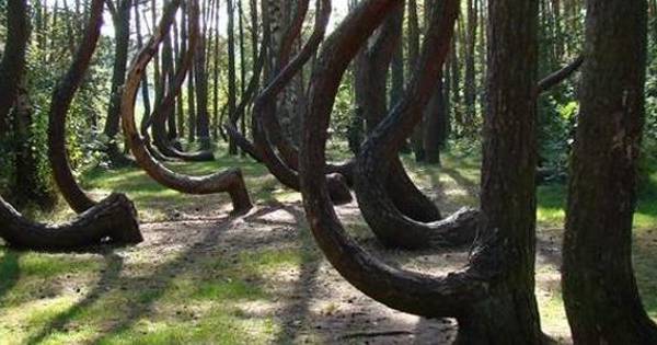 Decenas de árboles torcidos adornan el bosque ubicado en Gryfino al oeste de Polonia. Este se compone de unos 400 pinos con una curiosa curva de 90 grados orientados hacia el norte en las bases de sus troncos.