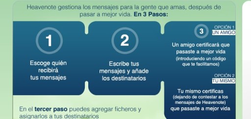 Una web gratuita llamada "Heavenote" permite a los usuarios enviar mensajes a sus amigos y familiares después de la muerte. La propia plataforma web se encarga de enviar los mensajes de correo electrónico al usuario, para comprobar periódicamente si todavía está vivo.