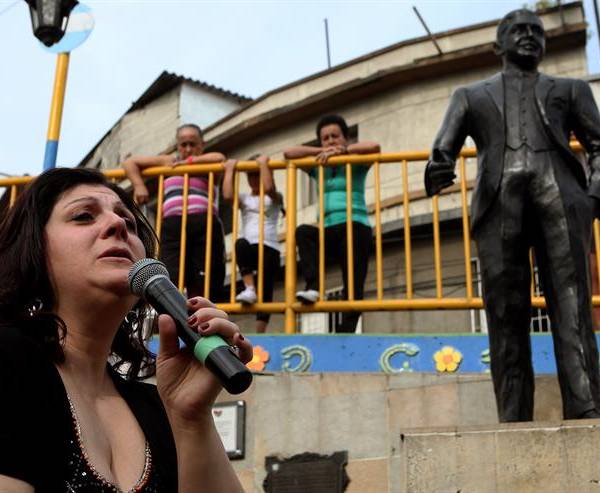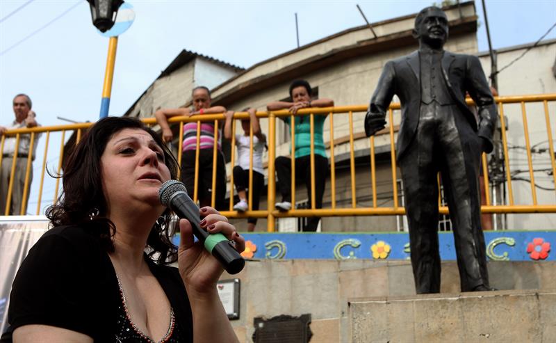 Cantante argentina Sandra Luna interpreta un tango frente a la estatua de Carlos Gardel en Medellín. Foto: EFE
