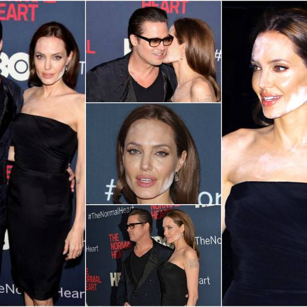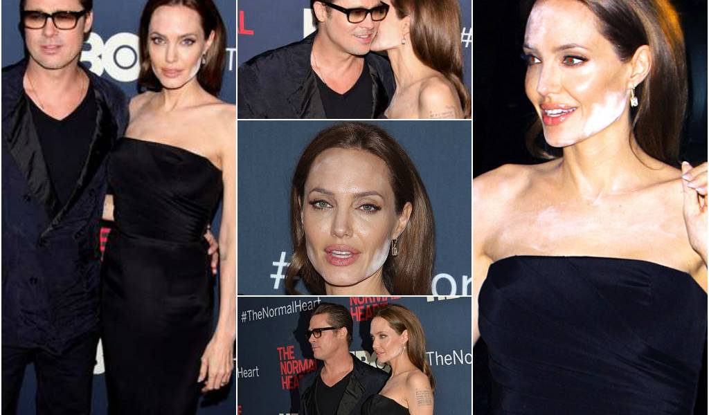 Acostumbrados a verla lucir perfecta en todos los eventos, esta vez la bella estadounidense desconcertó a sus fanáticos, pero no por su escote, sino por su extraño maquillaje. Aunque ella posaba muy segura de sí misma junto a su pareja, el actor Brad Pitt, las cámaras no paraban de registrar las notorias manchas blancas en su rostro.