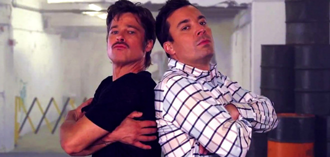 Brad Pitt promocionó su nueva cinta "Fury" en The Tonight Show con Jimmy Fallon a través de un divertido sketch en el que conversan bailando al estilo urbano en un estacionamiento subterráneo. En la grabación el actor y el humorista intercambian diálogos, a través de subtítulos, a ritmo de Hip Hop. "Cómo va todo?" Pitt le preguntó con un giro en el suelo. "Bien", respondió Fallon, realizando otras maniobras en el suelo.