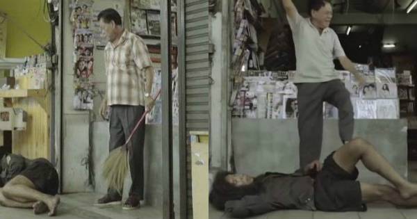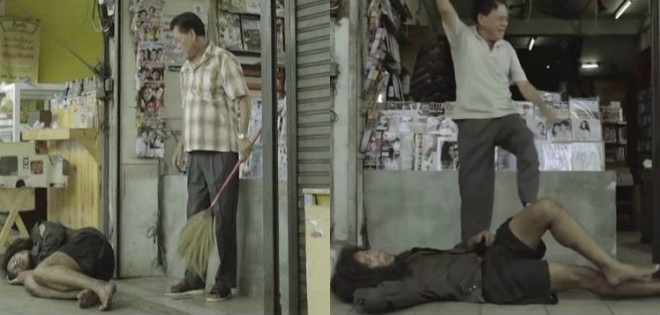 Campaña publicitaria.- El dueño de una tienda maltrata a un indigente que siempre aparece dormido en la entrada de su local. Foto: captura de video.
