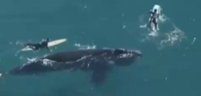 En las imágenes del helicóptero Nine News puede verse a un surfista tratando de hacer un escape rápido cuando la ballena hizo un giro brusco hacia él, mientras que otros se quedaron atrás y vieron la ballena desde la distancia.