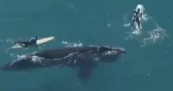 Un grupo de surfistas tuvo un encuentro muy cercano con una enorme ballena en las playas del norte de Sydney este domingo. El helicóptero del Nine News captó el momento en que un grupo de surfistas se unía ballena